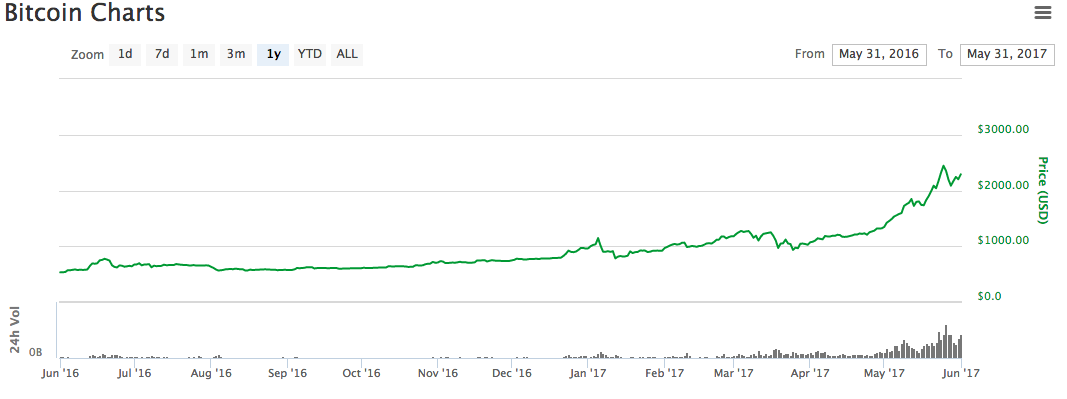 $1,000 in Bitcoin in January 2017 would be worth around $2,200 in May 2017